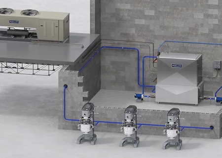 The industrial bakery water chilling solution is well-suited for bakeries requiring 240 gallons (908.5 liters) of chilled water per hour or more. The solution is appropriate for multiple points of use and compatible with existing centralized refrigeration systems using Freon or ammonia refrigerants.